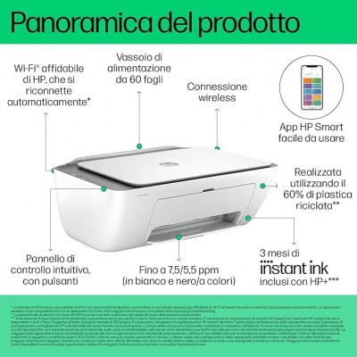 CONNETTIVITÀ: è possibile stampare da pc, smartphone e tablet con l'app HP Smart che si connette ai dispositivi attraverso il Wireless Dual Band, Wi-Fi Direct, AirPrint e Mopria; Cavo USB non incluso